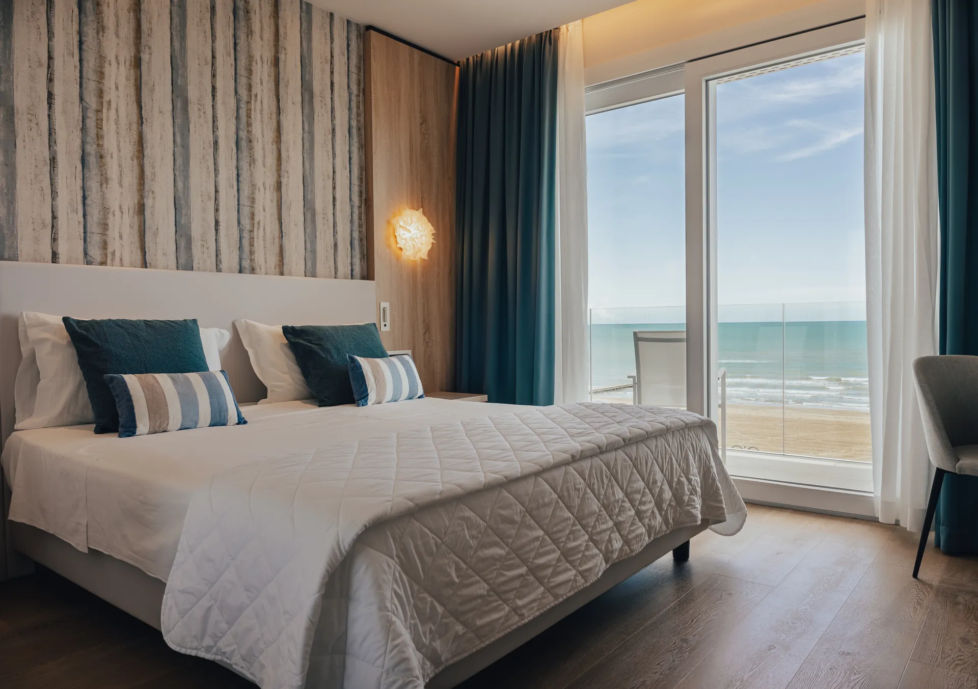Sessantuno nuove camere di cui otto suites fronte mare, tutte con ampi terrazzi e una meravigliosa vista. Ideate dai migliori architetti e con tutti i più moderni comfort: cassaforte, minibar, climatizzazione, TV-LCD 40″, illuminazioni led. Gli elementi lignei e i colori marini agevoleranno il riposo e il relax in camera. Nuovissimi bagni caratterizzati da piani in KRION e ampi box doccia con ante in cristallo